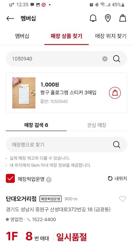- 제품번호 입력 후 주변 재고 보유 매장 확인: 제품번호를 입력하여 주변 매장에서 재고를 확인한다.
