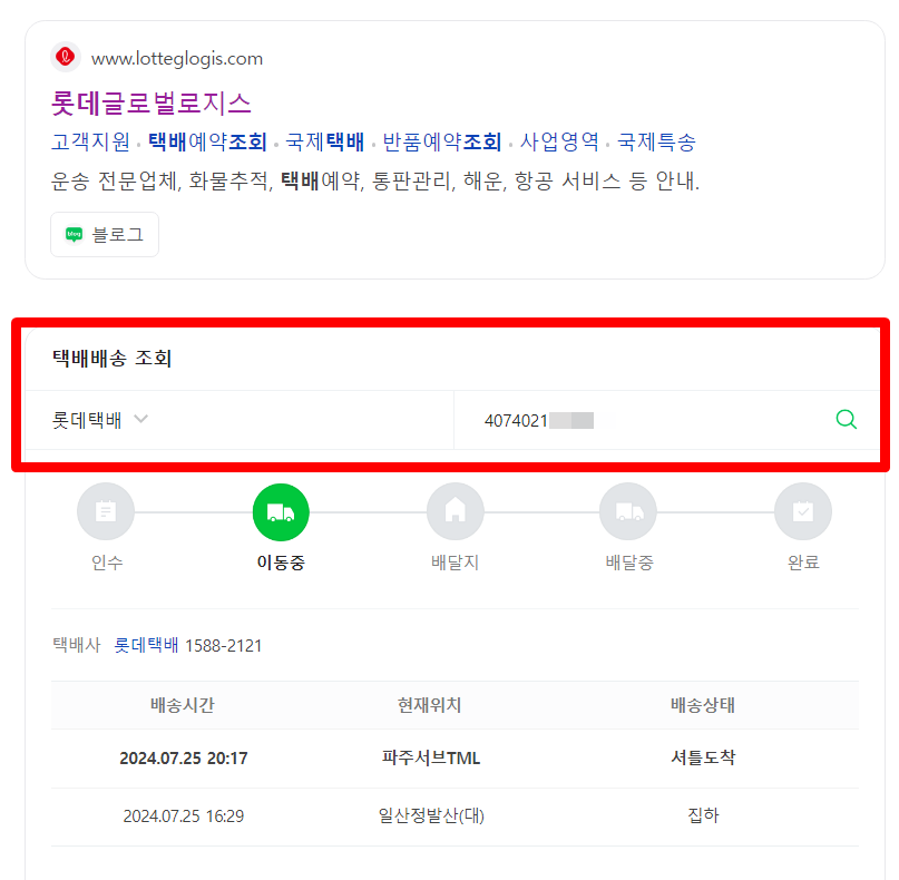 롯데택배배송조회를 하고 싶은 분들을 위한 방법이니 그냥 한 번 따라해보자. 네이버 검색창에 롯데택배배송조회라고 검색하면 아래에 배송조회라는 창이 뜬다. 여기에 송장번호를 입력하면 내 택배가 어디쯤 있는지 알 수 있다. 7월 25일 현재 4시쯤 일산정발산에서 오후 8시에는 파브서브 TML에 도착해 있는 것을 확인할 수 있다. 이렇게 확인해보면 내일 오전 중에는 택배기사님에게 인수되어 배달을 받을 수도 있겠네요.